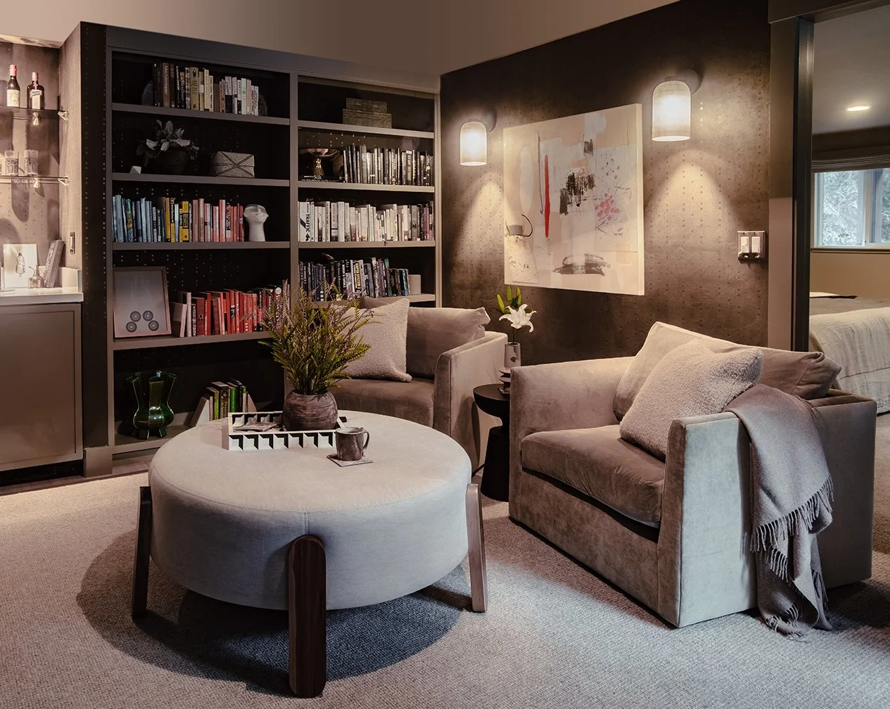 Primary Sitting Room: Adjacent to the primary bedroom, we transformed a room into a cozy sitting area featuring a built-in bar and custom bookshelves. Suede wallpaper adds texture and warmth, while swivel chairs upholstered in mohair fabric and alpaca pillows provide both comfort and timeless style.
